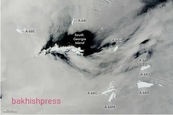 در یک عکس ماهوارهای که در تاریخ ۱۱ فوریه ۲۰۲۱ گرفته شده، خطوط ناهموار ۱۱ کوه یخ شکسته در اطراف یک جزیره دور افتاده و پر از پنگوئن به نام “جورجیای جنوبی”(South Georgia) واقع در حدود ۱۵۰۰ کیلومتری شمال شرقی شبه جزیره جنوبگان قرار دارد.
